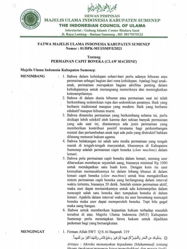 Sedangkan fatwa yang dikeluarkan MUI Sumenep tersebut bernomor DPK-MUI/SMP/2023 tentang permainan capit boneka (claw machine) tertanggal 1 Januari 2023.