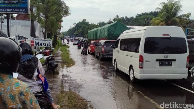 Pantauan detikJatim, arus lalu lintas tampak macet panjang. Puluhan motor ada yang nekat melintas atau memilih berhenti untuk kembali melewati jalur lain atau bahkan menunggu air surut.