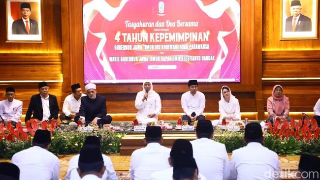 Pemprov Jawa Timur menggelar tasyakuran dan doa bersama memperingati 4 tahun kepemimpinan Khofifah Indar Parawansa-Emil Elestianto Dardak memimpin Jawa Timur. Acara diselenggarakan di Gedung Grahadi, Senin (13/2/2023) malam.