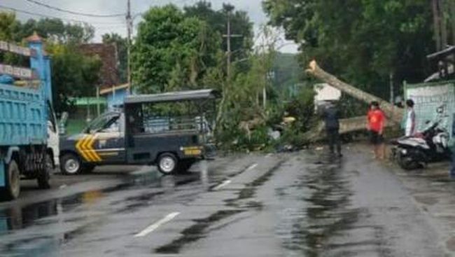 Sebuah motor yang melintas di Jalan Pare Wates, Kediri, tertimpa pohon tumbang. Ayah tewas, anak selamat.