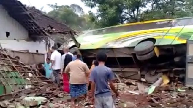 Sebuah bus wisata terguling lalu menabrak rumah warga di jalur Taman Safari Prigen, Pasuruan. Rumah warga yang tertabrak rusak berat.