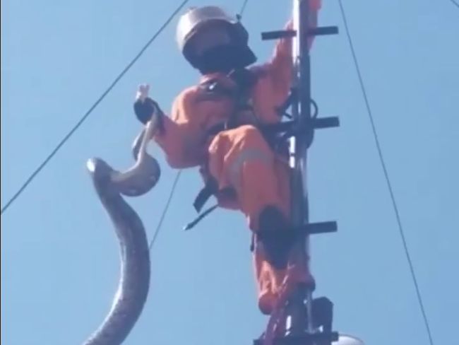 Dua orang petugas berseragam pengaman lengkap memanjat tower untuk melakukan evakuasi. Setelah 1 jam proses evakuasi, petugas berhasil menangkap kepala ular itu kemudian menarik tubuhnya yang cukup kuat melilit tiang pemancar.
