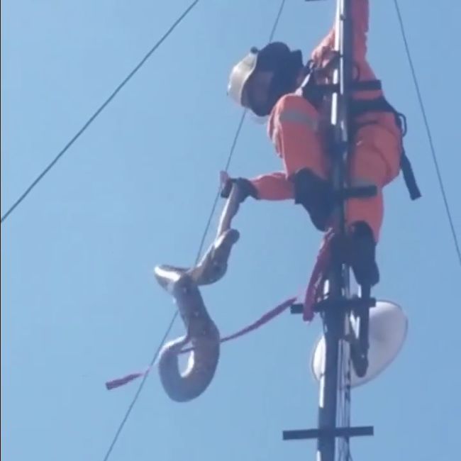 Seorang petugas berseragam pengaman lengkap dengan sigap memanjat tower mengevakuasi ular tersebut. Video detik-detik evakuasi ini direkam dan diunggah di media sosial.