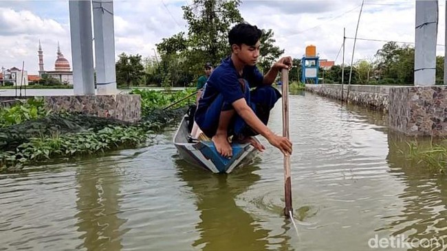 Warga Desa Bojoasri, Kecamatan Kalitengah tak kehabisan akal. Mereka menggunakan perahu untuk menunjang aktivitas di tengah banjir.