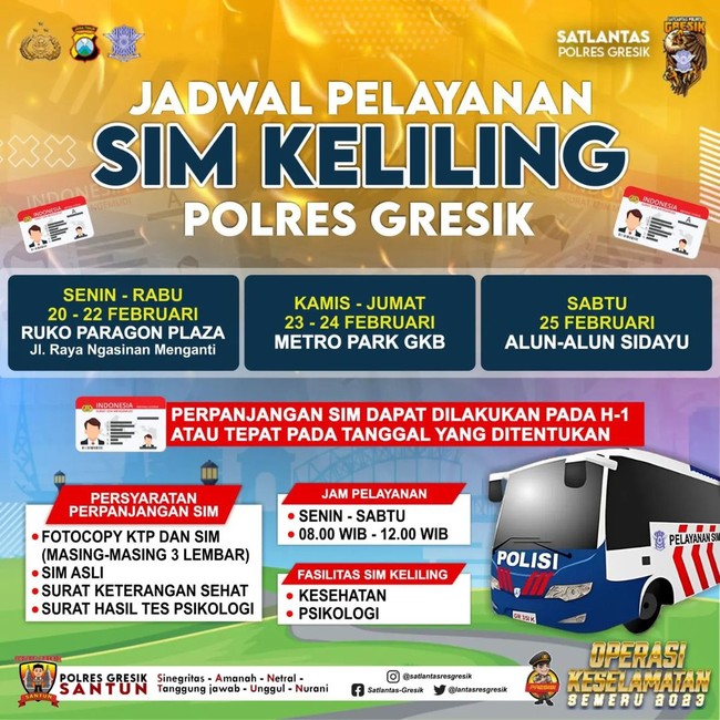 SIM keliling Polres Gresik tetap melayani warga setiap minggunya. Di mana saja mobil SIM keliling Gresik mangkal selama sepekan ini?