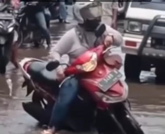 Dalam video berdurasi 1.30 detik itu tampak emak-emak berusaha tetap menyangga motornya agar tidak jatuh. Lalu dengan sekuat tenaga ia mencoba mengangkat motornya ke pinggir jalan. Seorang warga yang ada di sekitar lokasi juga menolong sang ibu tersebut.
