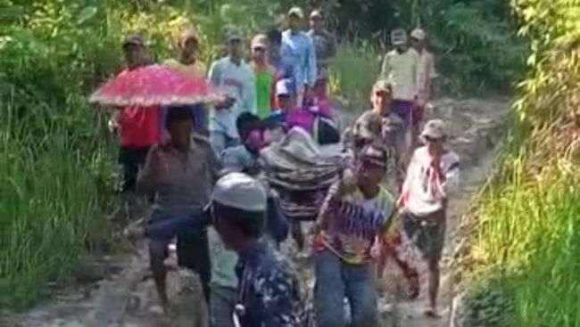 "Ditandu dari rumah mau dibawa ke RSUD Ploso, Jombang. Karena mobil tidak bisa lewat. Kondisi jalan berlumpur, licin dan naik turun. Jaraknya sekitar 8 Km dari Kedung Dendeng ke Dusun Brangkal," ungkap pria yang juga menjabat Kasi Kesejahteraan Rakyat Desa Jipurapah ini.