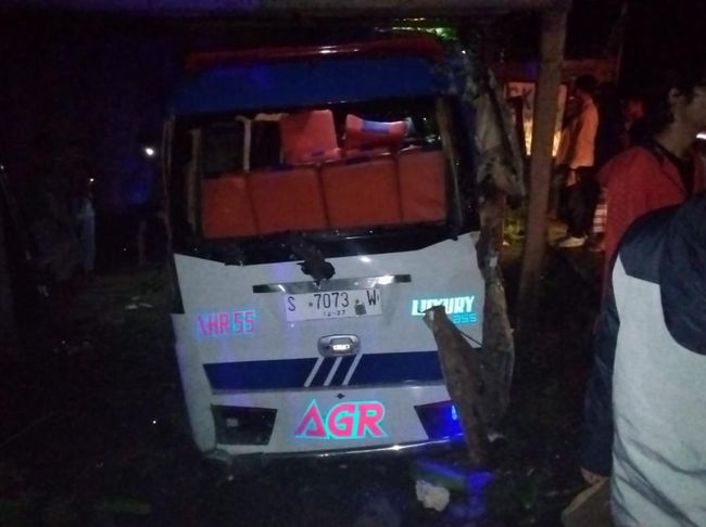 Sampai di Jalan Raya Desa Palrejo, Sumobito tengah malam tadi sekitar pukul 24.00 WIB, minibus diseruduk bus yang melaju di belakangnya.