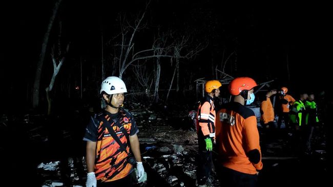 Dengan berbekal lampu yang biasa untuk mengevakuasi korban bencana, ditambah head lamp yang terpasang di helm, para petugas berjibaku mencari tubuh korban ledakan dahsyat yang disebut-sebut akibat petasan ini.