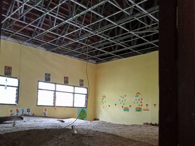 "Jaringan listrik juga masih putus, belum dibenahi. Maka siswa kami belajar tetap dengan tatap muka di halaman sekolah," ujarnya.