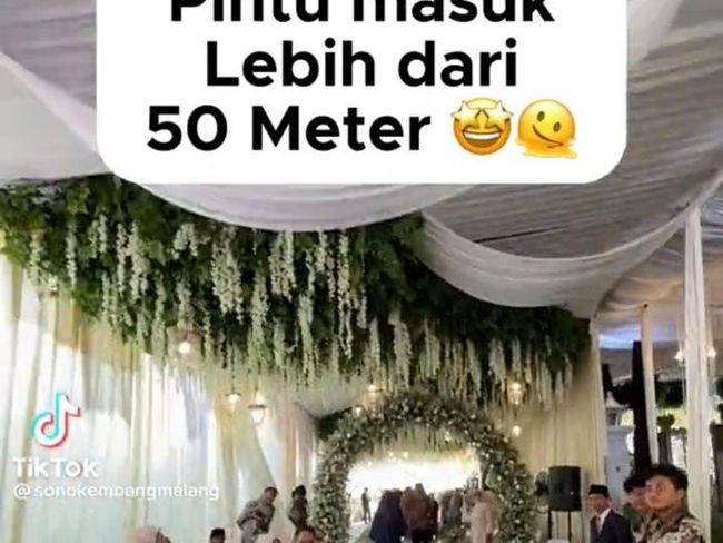 Video pernikahan di rumah bak di hotel mewah itu viral usai diunggah akun TikTok @sonokembangmalang. Dalam video, tampak sejumlah tamu undangan sedang antre di lokasi photobooth. Berjalan menuju pelaminan, ada lorong dihiasi bunga yang aesthetic.