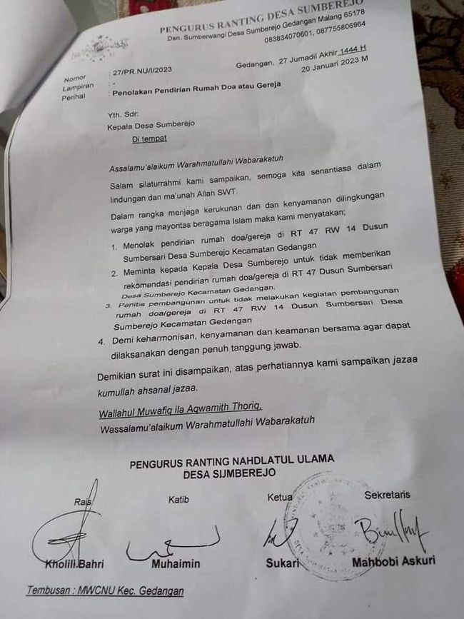 Beredar surat penolakan pembangunan Gereja Kristen Jawi Wetan (GKJW) yang berlokasi di Desa Sumberejo, Kecamatan Gedangan, Kabupaten Malang. Surat penolakan itu dibuat oleh Pengurus Ranting Nahdlatul Ulama (PRNU) desa setempat.