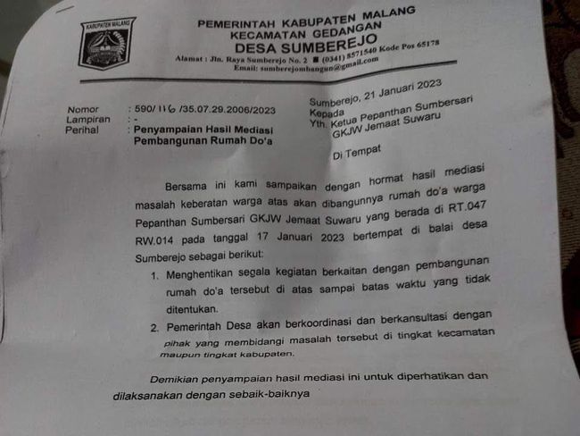 "Menghentikan segala kegiatan berkaitan dengan pembangunan rumah doa tersebut di atas sampai batas waktu yang tidak ditentukan," demikian bunyi surat mediasi yang diterima detikJatim, Rabu (8/3/2023).