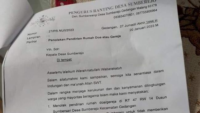 Pengurus ranting Sumberejo Nahdlatul Ulama di Kabupaten Malang menolak pembangunan gereja. Forum Kerukunan Umat Beragama (FKUB) menyebut adanya kesalahpahaman terkait penolakan itu.