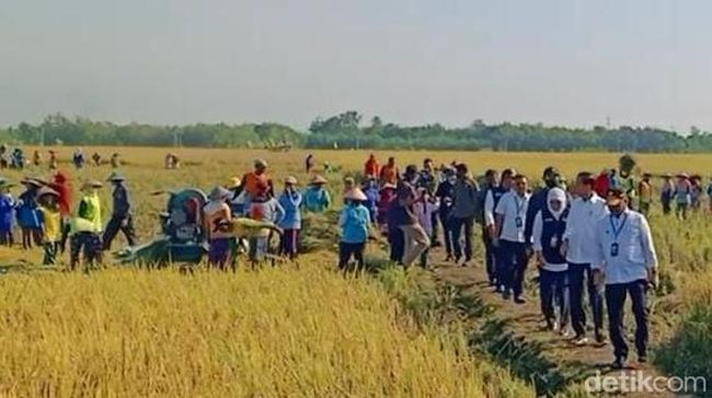 Petani gembira karena mereka mendapat amplop dari Jokowi saat sedang memanen padi.