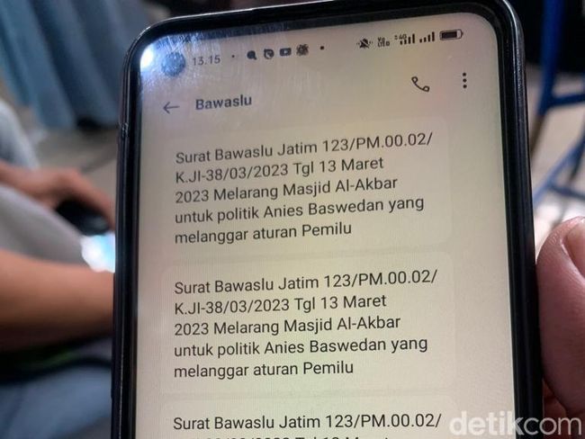 Dalam SMS blast itu berisi pesan 'Surat Bawaslu Jatim 123/PM.00.02/K.JI-38/03/2023 Tgl 13 Maret 2023 Melarang Masjid Al Akbar untuk politik Anies Baswedan yang melanggar aturan Pemilu'.