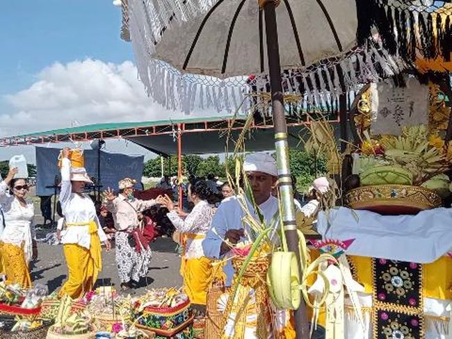 Setelah doa, sesaji itu dilarung ke laut. Setelah itu tokoh agama mengambil air suci di tengah laut untuk keperluan Upacara Melasti disambut dengan tari-tarian Umat Hindu.