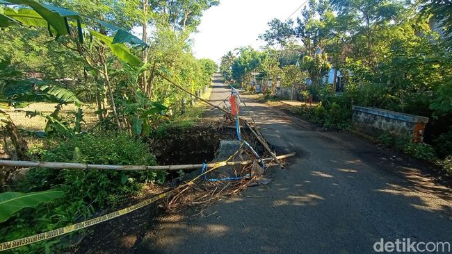 "Khawatir kalau ambrolnya tambah lebar. Lha ini sudah muncul retakan lagi. Makanya kami berinisiatif memberi bambu sama tali rafia biar yang lewat gak terlalu minggir," kata Kateni warga sekitar jembatan, Senin (20/3/2023).