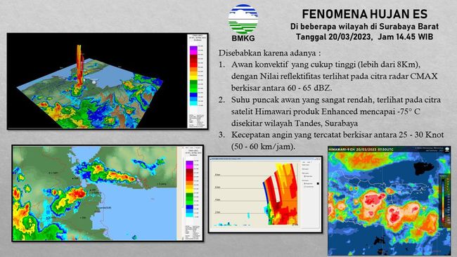 "Betul, tadi ada laporan hujan es di Surabaya. Tapi, sedang kami kroscek kembali," kata Ary saat dikonfirmasi, Senin (20/3/2023).