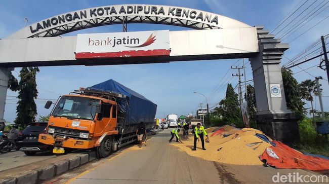 Gandengan truk yang berisi muatan kedelai terguling ke jalan. Meski tidak ada korban jiwa, tapi muatan yang tumpah membuat jalan poros nasional di Lamongan ini macet.