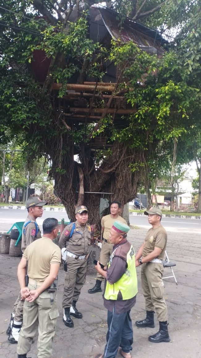 Setelah mendapat pengaduan, Satpol PP bergerak mendatangi lokasi. Ternyata benar, di balik ranting pohon beringin dibuat tempat hunian beserta alasnya.