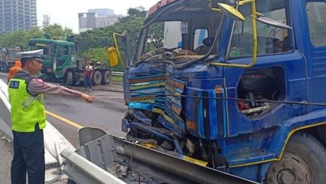 Dua kendaraan itu melintang di tengah jalan hingga menutup semua lajur. Dampaknya kecelakaan truk yang menabrak pembatas itu macet total.