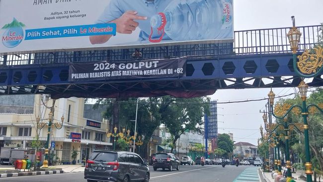 "2024 Golput Pilihan Realistis Atas Matinya Keadilan di +62," demikian bunyi spanduk tersebut saat dilihat detikJatim pada Minggu (26/3/2023).