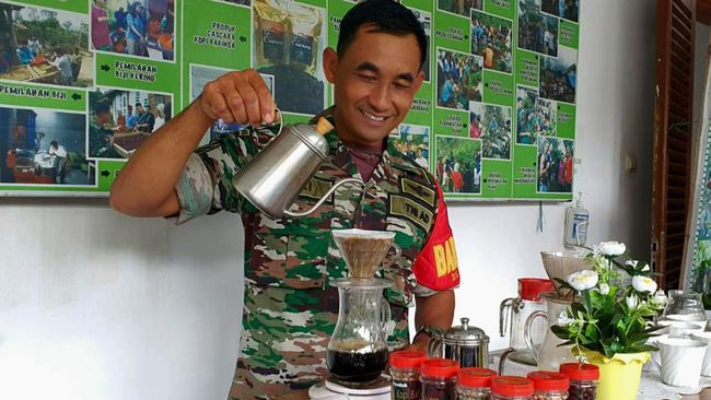 Kesibukan Sersan Kepala (Serka) Heri Purnomo sebagai Babinsa di Desa Taji, Kecamatan Jabung, Kabupaten Malang tidak menyurutkan semangatnya untuk berkembang. Hal itu dibuktikannya dengan menggeluti usaha kopi.