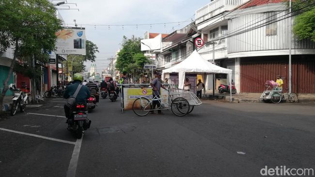 Puluhan petugas gabungan diterjunkan menjaga pintu masuk. Banyak pengayuh becak yang belum mengetahui aturan baru menerobos masuk, namun petugas segera menghalau mereka dan memberikan sosialisasi.