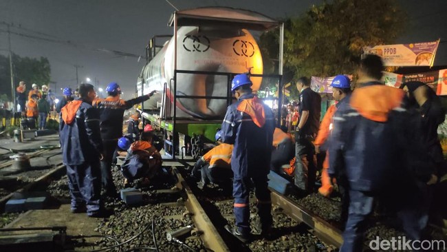 Kereta Api BBM anjlok di Jalan Raya Bebekan, Taman Sidoarjo. Pertamina memastikan insiden tersebut tidak sampai mengganggu suplai BBM.