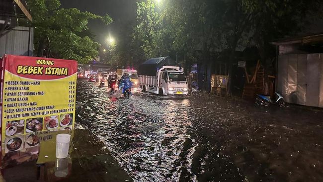 Hujan deras sejak sore membuat sejumlah titik di Kota Surabaya banjir. Genangan air bahkan sampai lutut orang dewasa di beberapa lokasi.