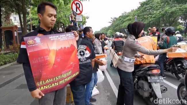 Ditlantas Polda Jatim bersama Komunitas Motor Besar Indonesia (MBI) mensosialisasikan 'Tiga Siap' kepada pengguna jalan jelang Mudik Lebaran 2023. Mereka sosialisasi soal keselamatan berlalu lintas sambil membagikan takjil.