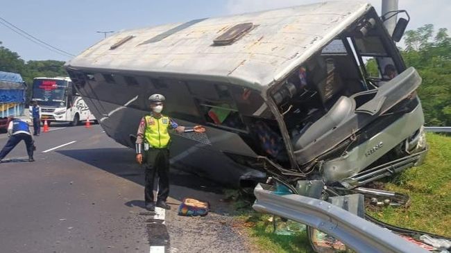 Sebelumnya, Kanit PJR Jatim II AKP Ega Prayudi mengatakan, Bus Hino jurusan Jember-Surabaya ini terlihat setengah terguling karena menabrak pembatas jalan tol. Sementara itu, bus juga naik ke rerumputan.