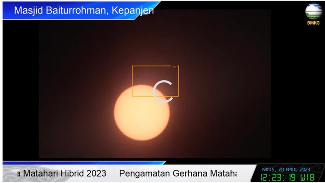 "Proses gerhana matahari hibrid di wilayah Kepanjen berlangsung selama 2 jam 45 menit. Mulai pukul 09.27 WIB, puncaknya pada pukul 10.55 WIB dan lepas kontak pada pukul 12.22 WIB," terang Kepala Stasiun Geofisika Malang, Ma'muri kepada detikJatim di masjid Baiturrahman, Kepanjen, Kamis (20/4/2023).
