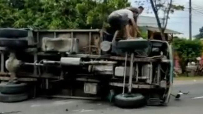 "Akibat kejadian ini, dump truk terguling sementara pikap mengalami kerusakan pada bagian depan," tandasnya.