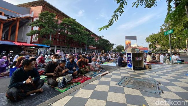 Warga Muhammadiyah merayakan Lebaran hari ini. Di Surabaya, salah satu lokasi yang menggelar salat Idul Fitri berada di depan Stadion Gelora 10 Nopember, persisnya di area Taman Mundu.