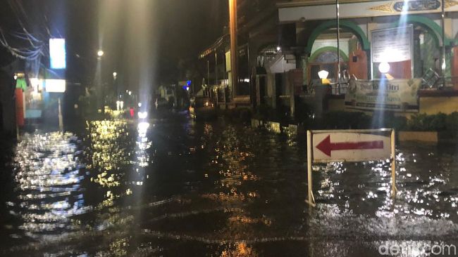 Hujan deras yang mengguyur saat malam takbir menyebabkan banjir di sejumlah wilayah Surabaya. Salah satunya di kawasan Kutisari.