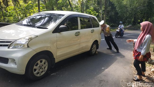 "Tahan dulu remnya, jangan dilepas," kata Kasat Lantas AKP Siswoyo sembari memasang sebongkah batu untuk mengganjal ban belakang mobil jenis MPV, Senin (24/4/2023).