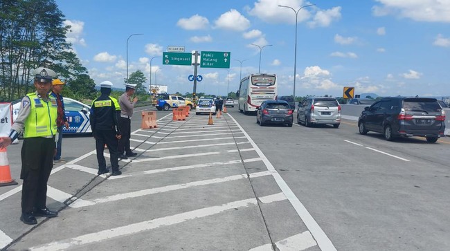Polisi menerapkan pengalihan arus lalu lintas di Simpang Karanglo, Kabupaten Malang. Ini karena volume kendaraan mengalami kepadatan.