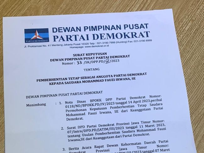 Sebelumnya, dalam salinan surat yang diterima detikJatim, surat pemecatan Fauzi Irwana tertuang dalam Surat Keputusan Dewan Pimpinan Pusat Partai Demokrat Nomor 33/SK/DPP.PD/IV/2023 Tentang Pemberhentian Tetap Sebagai Anggota Partai Demokrat Kepada Saudara Mohammad Fauzi Irwana, SE.