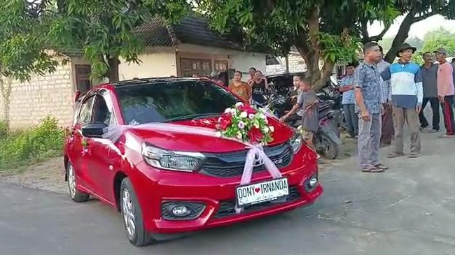 Seserahan sultan ini mulai dari sebuah mobil Honda Brio berwarna merah. Mobil tersebut dihias pita dan bunga hingga tertempel nama kedua calon mempelai. Lalu, ada seekor sapi dan kambing yang juga menjadi seserahan.