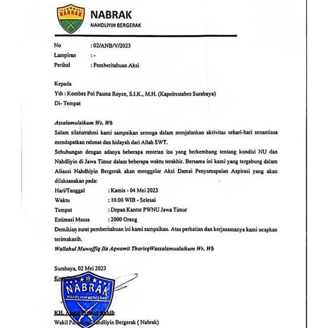 Surat itu ditandatangani oleh Wakil Panglima Nahdliyin Bergerak yakni KH Abdul Hamid Hukib.