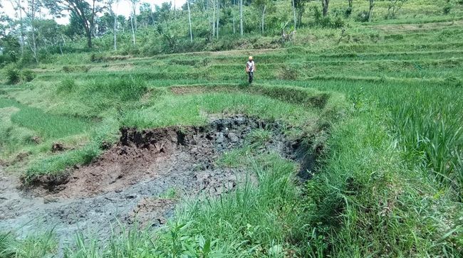 Sapto menerangkan bentuk sawah di lokasi tersebut terasering karena berada di tanah miring. Bagian atas, lanjut Sapto, ada retakan tanah yang kemudian terisi air persawahan.