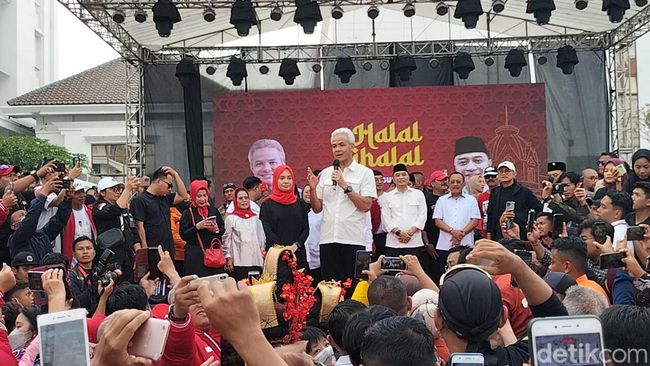Kerumunan warga yang menyambut Ganjar itu di antaranya terdiri dari para ibu-ibu pedagang UMKM, anak muda, serta berbagai komunitas yang turut diundang dalam acara yang juga bertema halalbihalal tersebut.
