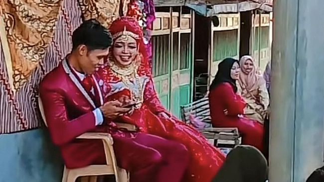 Dalam unggahan video berdurasi 15 detik itu, terlihat pasangan pengantin duduk di pelaminan berupa kursi plastik yang berada di depan halaman rumah tanpa alas karpet. Kedua pengantin serasi memakai busana pernikahan serba merah.