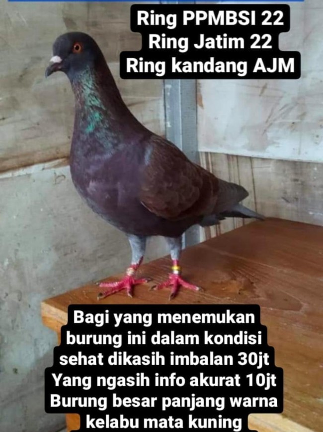 Ciri-ciri burung yang dicari berwarna coklat atau kelabu gelap atau beddeng. Burung bermata kuning, dengan tiga ring masing-masing satu di kaki kanan dan dua di kaki kiri. Tiga ring tersebut yakni Ring PPMBSI 22, Ring Jatim 22, Ring kandang AJM.