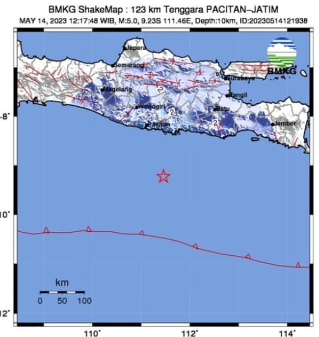 "Gempa Mag:5.0, 14-Mei-2023 12:17:00WIB," tulis peringatan BMKG yang diterima detikJatim, Minggu (14/5/2023).