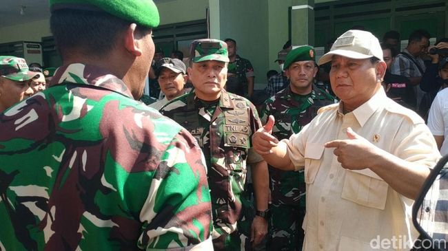 Usai bersalaman dengan warga, Menhan Prabowo lantas bergeser menuju halaman Koramil. Di tempat tersebut puluhan pasukan TNI telah berbaris menunggu kedatangannya. Prabowo sempat mengajak mereka ngobrol satu per satu.
