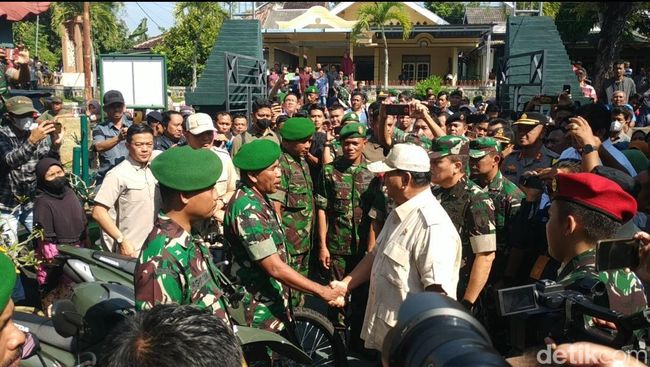 Sebelumnya, Prabowo tiba di Koramil Pacitan sekitar pukul 09.10 WIB. Dia menemui puluhan pasukan TNI berbaris menunggu kedatangannya.