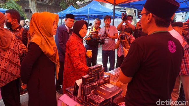 Sampailah Risma di lapak kopi bubuk. Ia mengawali candaannya dengan melontarkan pertanyaan dalam Bahasa Jawa. "Kabeh kok kopi? (Semua kok kopi?)," ujarnya di lokasi, Sabtu (20/5/2023).